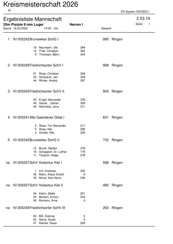Ergebnisliste Einzel Kreismeisterschaft 2026 – 25m Pistole 9mm Luger – 2.53