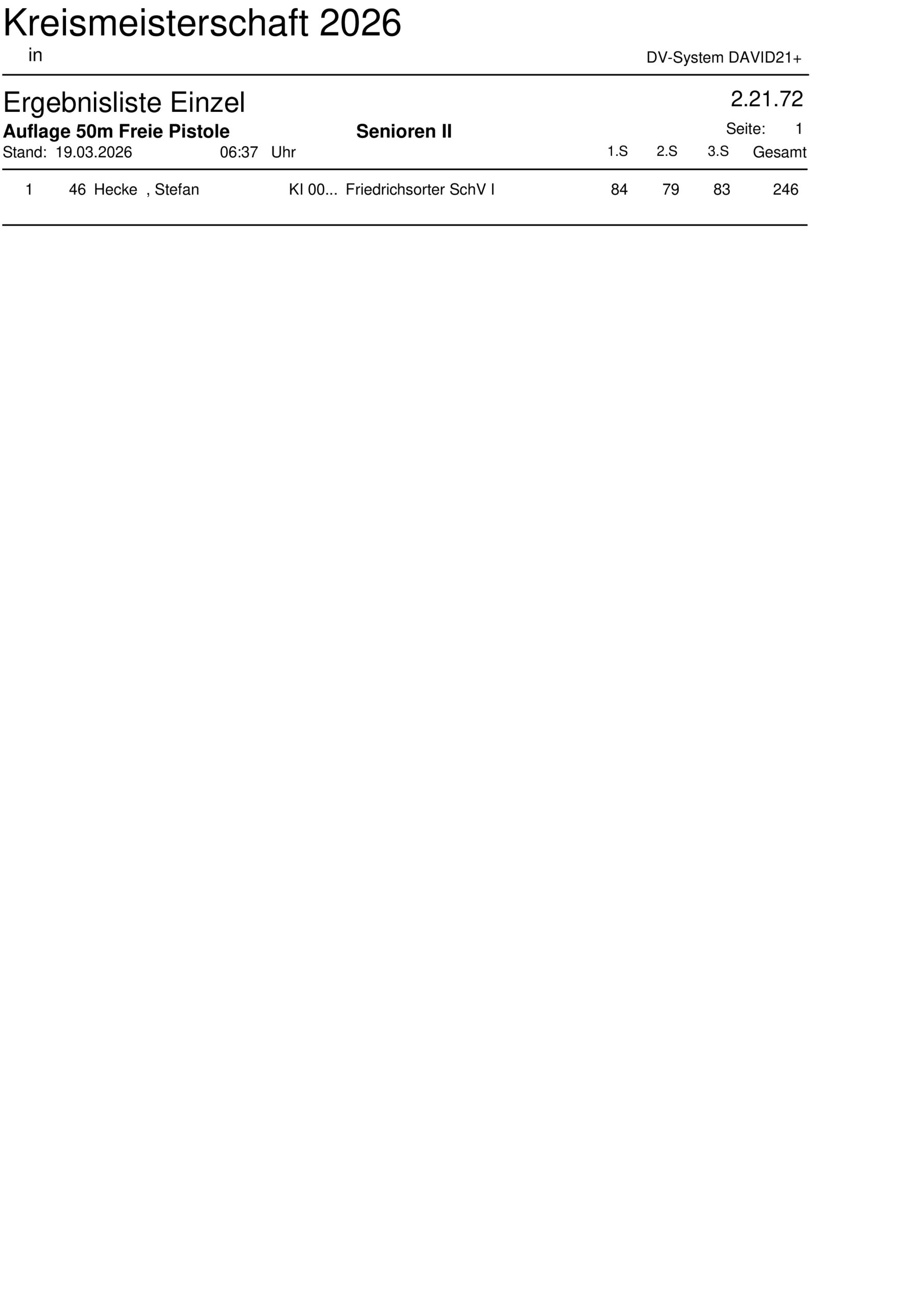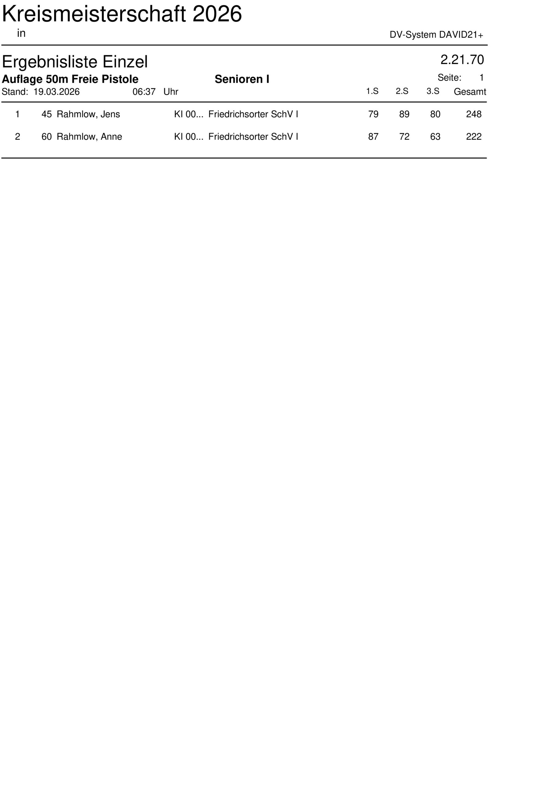 Ergebnisliste Einzel Kreismeisterschaft 2026 – 50m Freie Pistole Auflage – 2.21