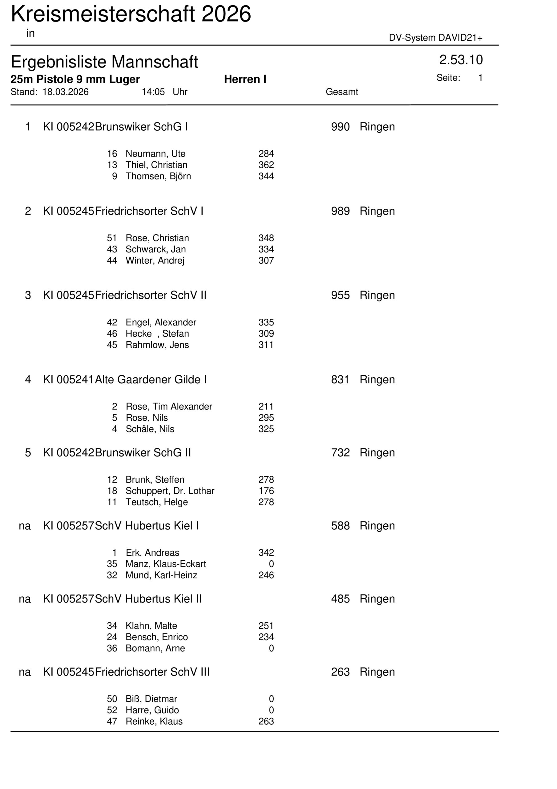 Ergebnisliste Einzel Kreismeisterschaft 2026 – 25m Pistole 9mm Luger – 2.53