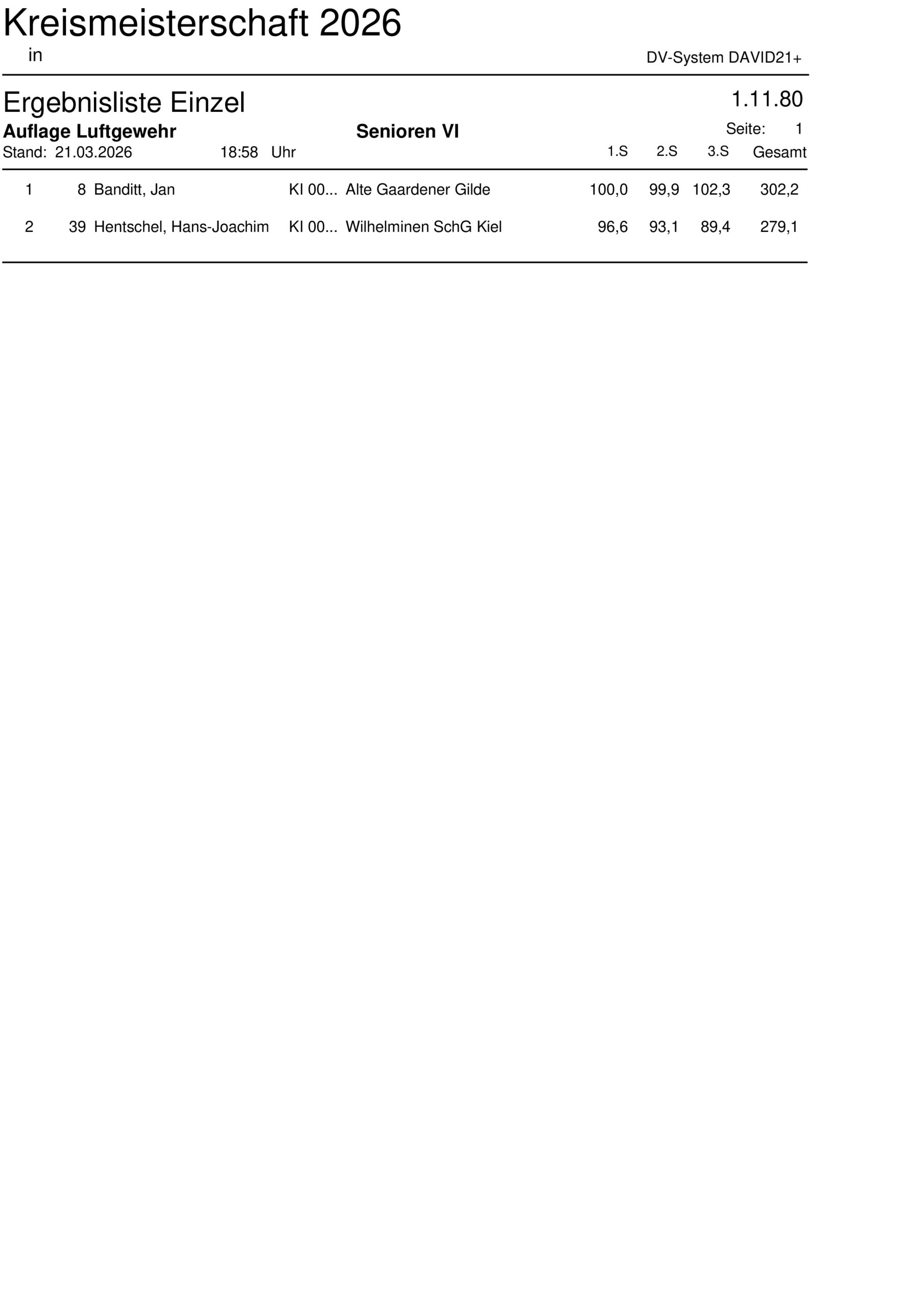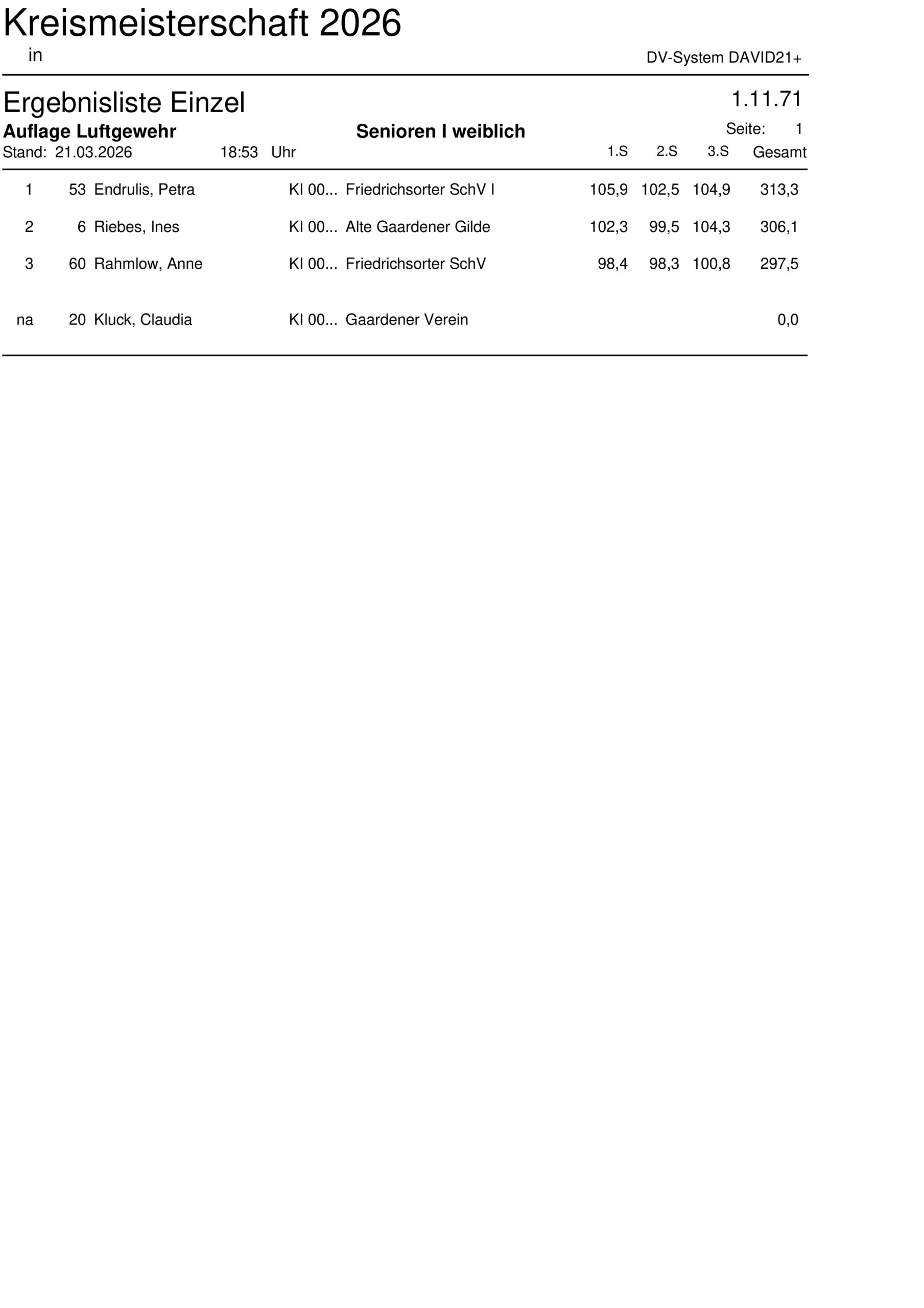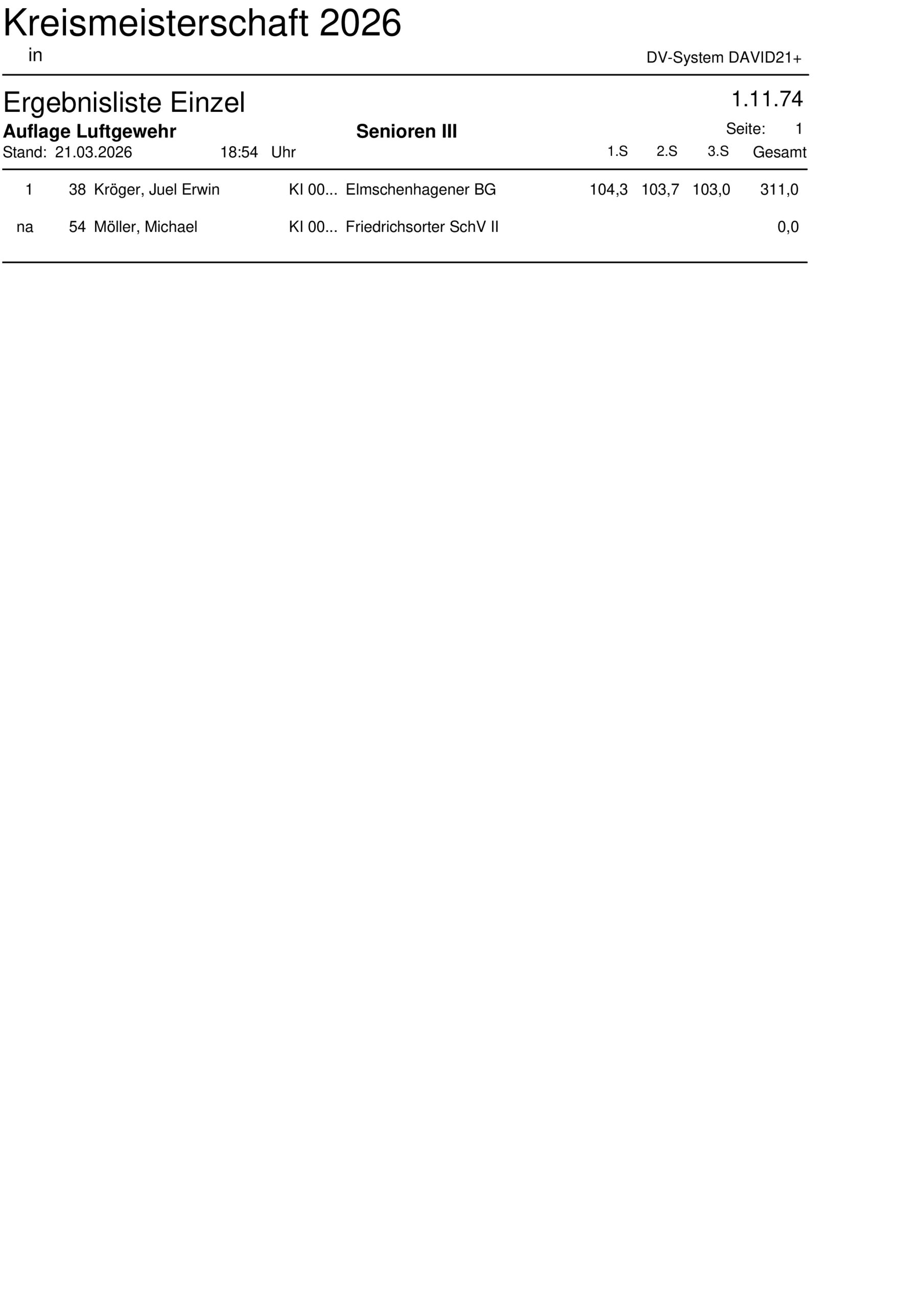 Ergebnisliste Mannschaft Kreismeisterschaft 2026 – 10m Luftgewehr Auflage – 1.11