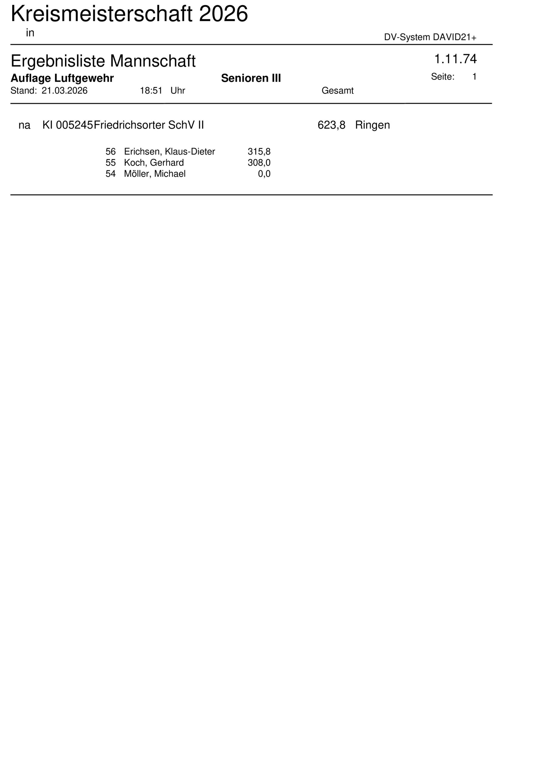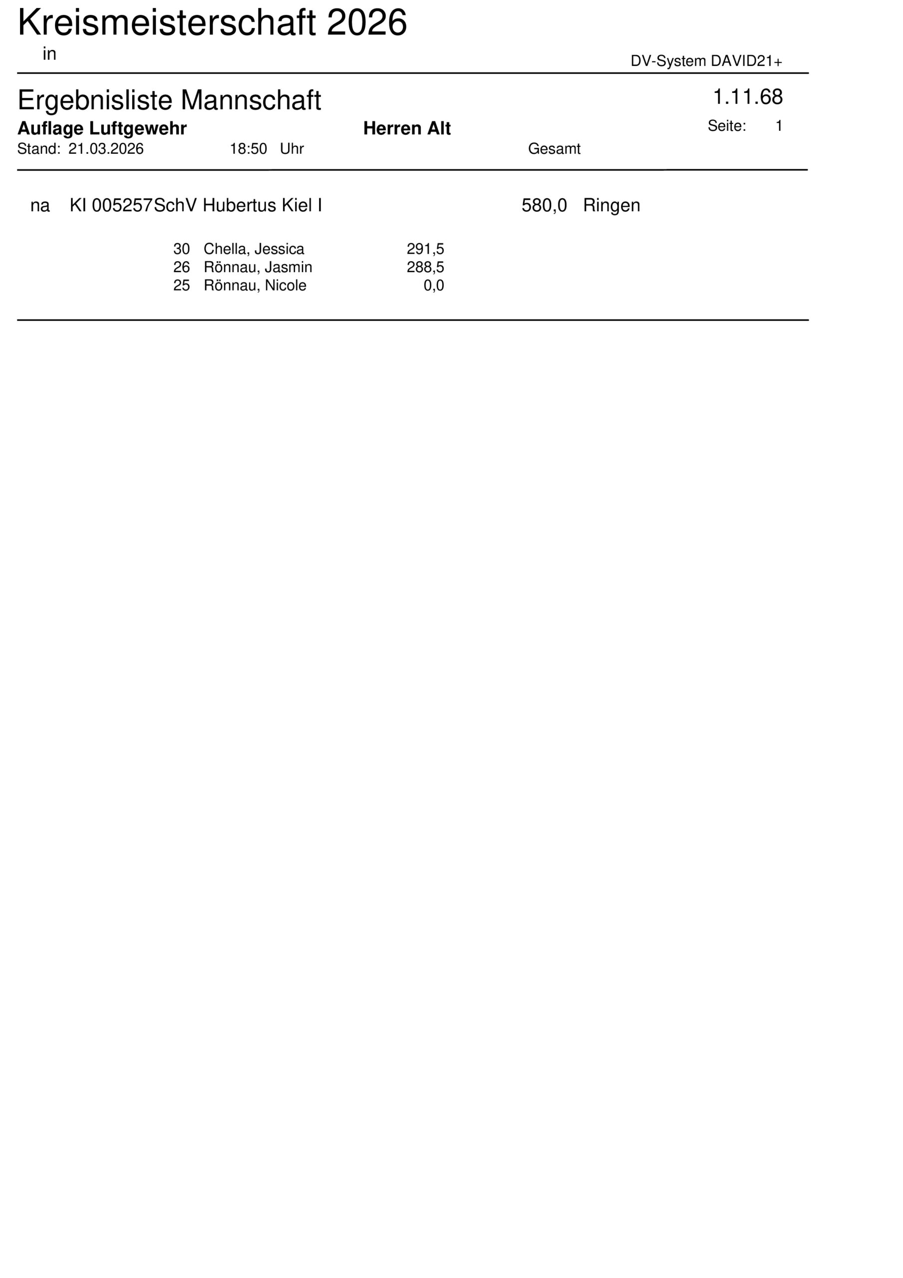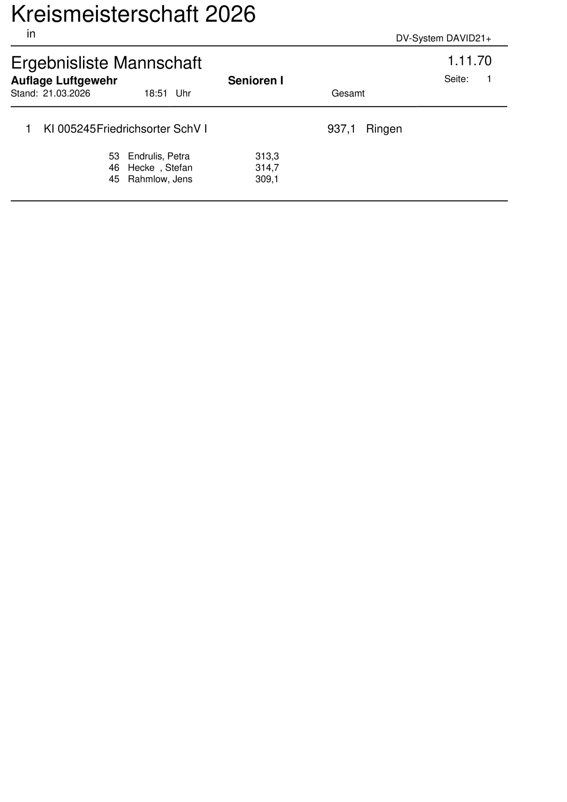 Ergebnisliste Mannschaft Kreismeisterschaft 2026 – 10m Luftgewehr Auflage – 1.11