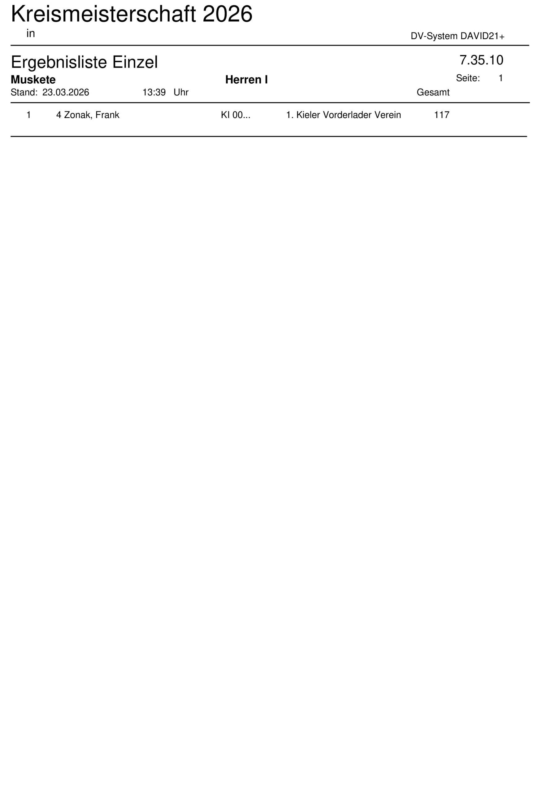Ergebnisliste Mannschaft Kreismeisterschaft 2026 – Steinschlossgewehr – 7.30